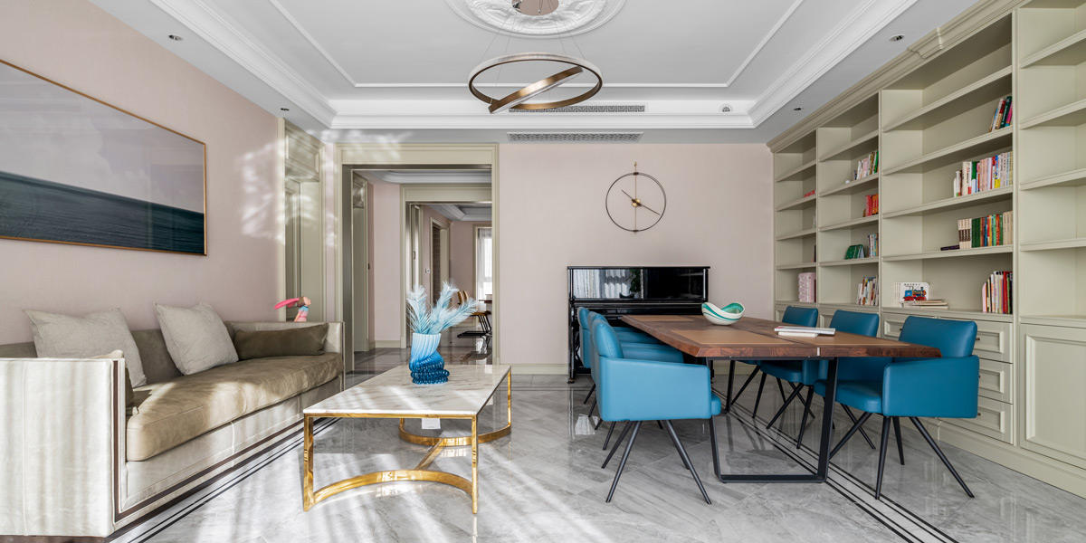 客廳采用磁吸軌道無主燈設計+定制燈帶,以舒適合理的線條,引領室內氛圍光,拉伸層高,擴充格局,讓業主真正感受私人訂制設計之美。