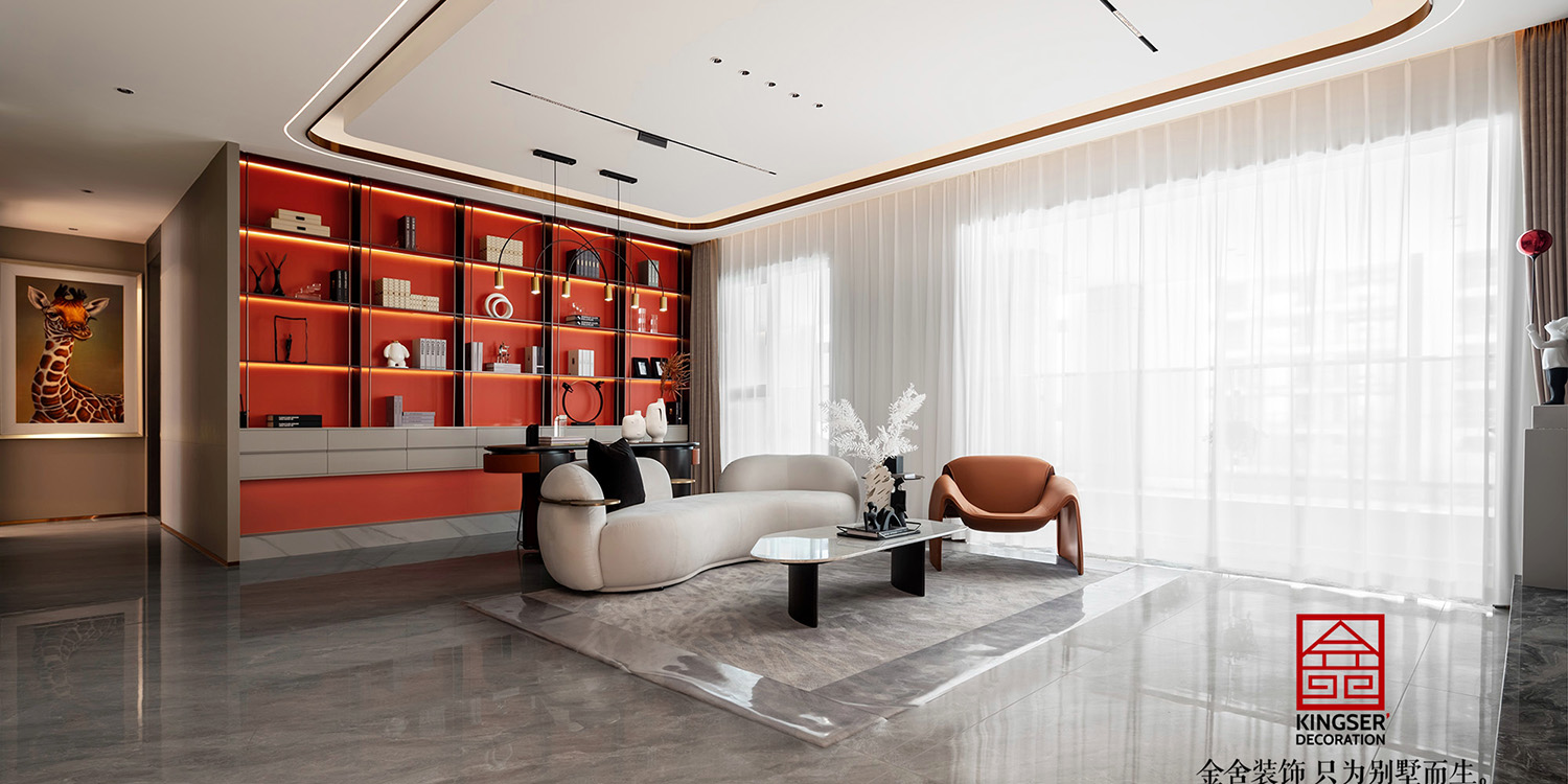 褪去城市繁冗華麗的外殼,回歸至與人的內在共鳴,斑駁的光影在客廳空間徜徉,大理石與墻板的搭配,釋放出一種優雅、沉靜及治愈的氛圍感,貫穿于整個別墅裝修空間的動線。